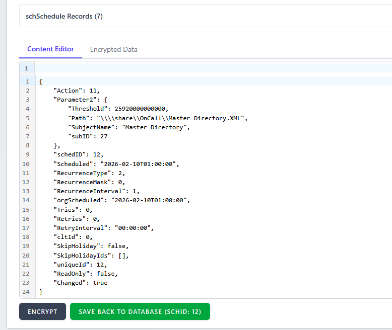 We also added another new utility that allows you to decrypt encrypted content in the Amtelco database, notably the schSchedule table. This allows easier updates to previously saved records that you can't otherwise copy/paste or have to go hunting in the database to find.